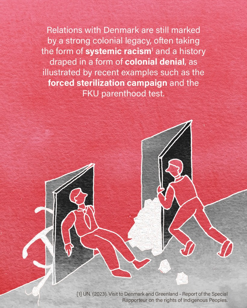 In recent years, the revelation of the colonial violence of the Kalaallit women’s sterilization campaign in the 1960s, described as genocide by Prime Minister Kalaaleq, has helped to document colonial remnants and challenge the myth of “benevolent colonialism”. More recently, the Danish Parenting Assessment Test (FKU), one of the psychometric tests widely used in Denmark to assess parenting skills, has been strongly criticized for reproducing racist discrimination. At the end of February, a demonstration against Danish racism was held in Nuuk, with the Prime Minister in attendance. In 2023, the Special Rapporteur on the Rights of Indigenous Peoples, José Francisco Calí Tzay, highlighted the discrimination suffered by the Kalaallit in accessing their rights, calling for “a process of reconciliation to address the legacy of colonialism and racism and, with the participation of the Inuit, to develop effective solutions and policies”.