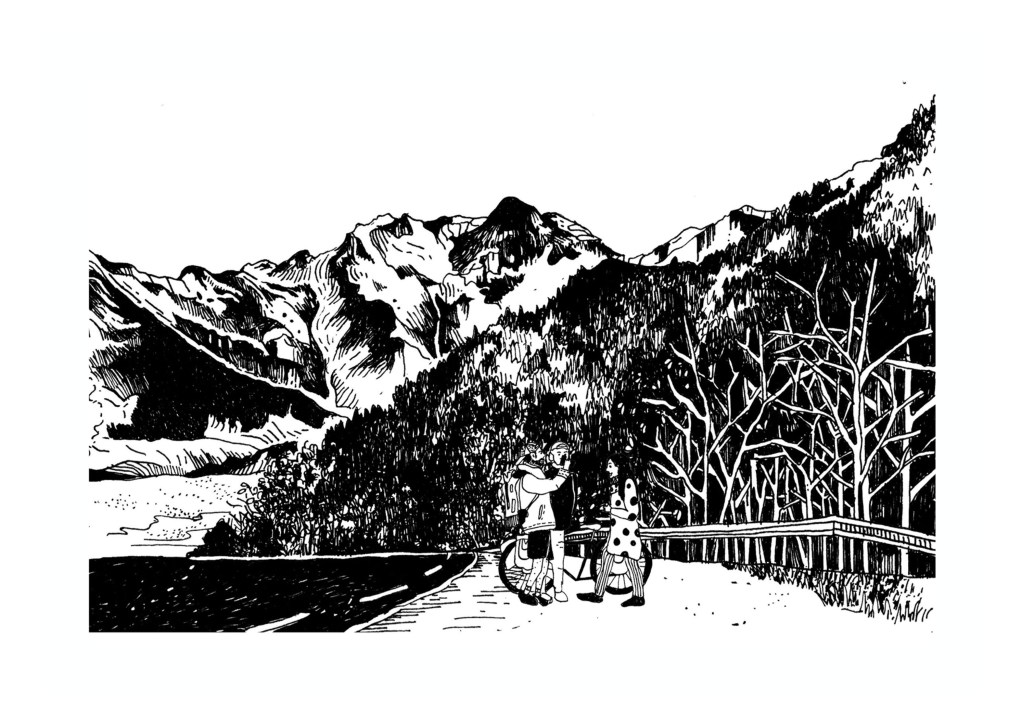 The drawings are inspired by the travel experiences of Tristan Vuillemin and Tanguy Sandré, and the accounts they gathered along the way. The drawings were created by landscape artist Manon Diekmann.